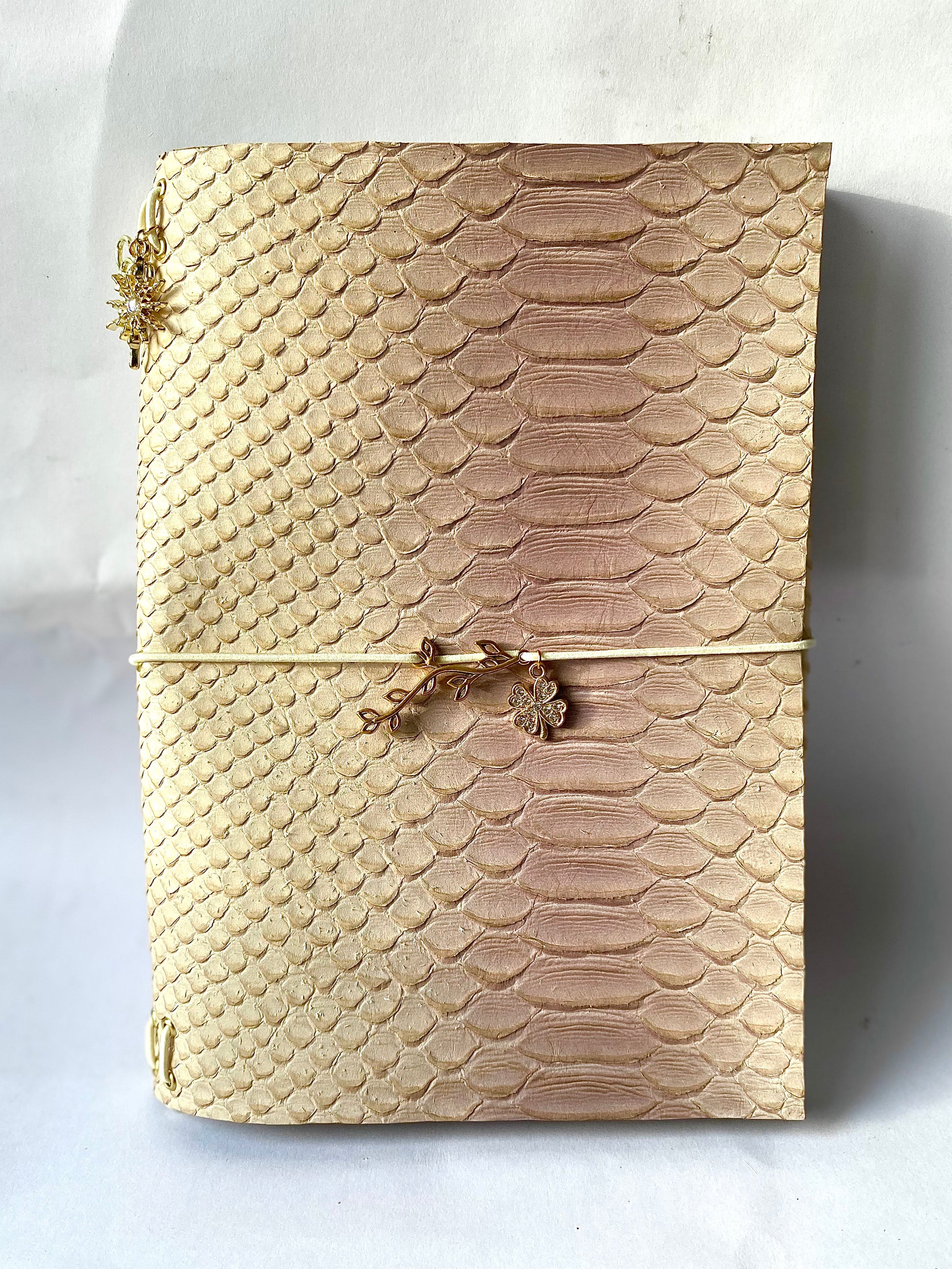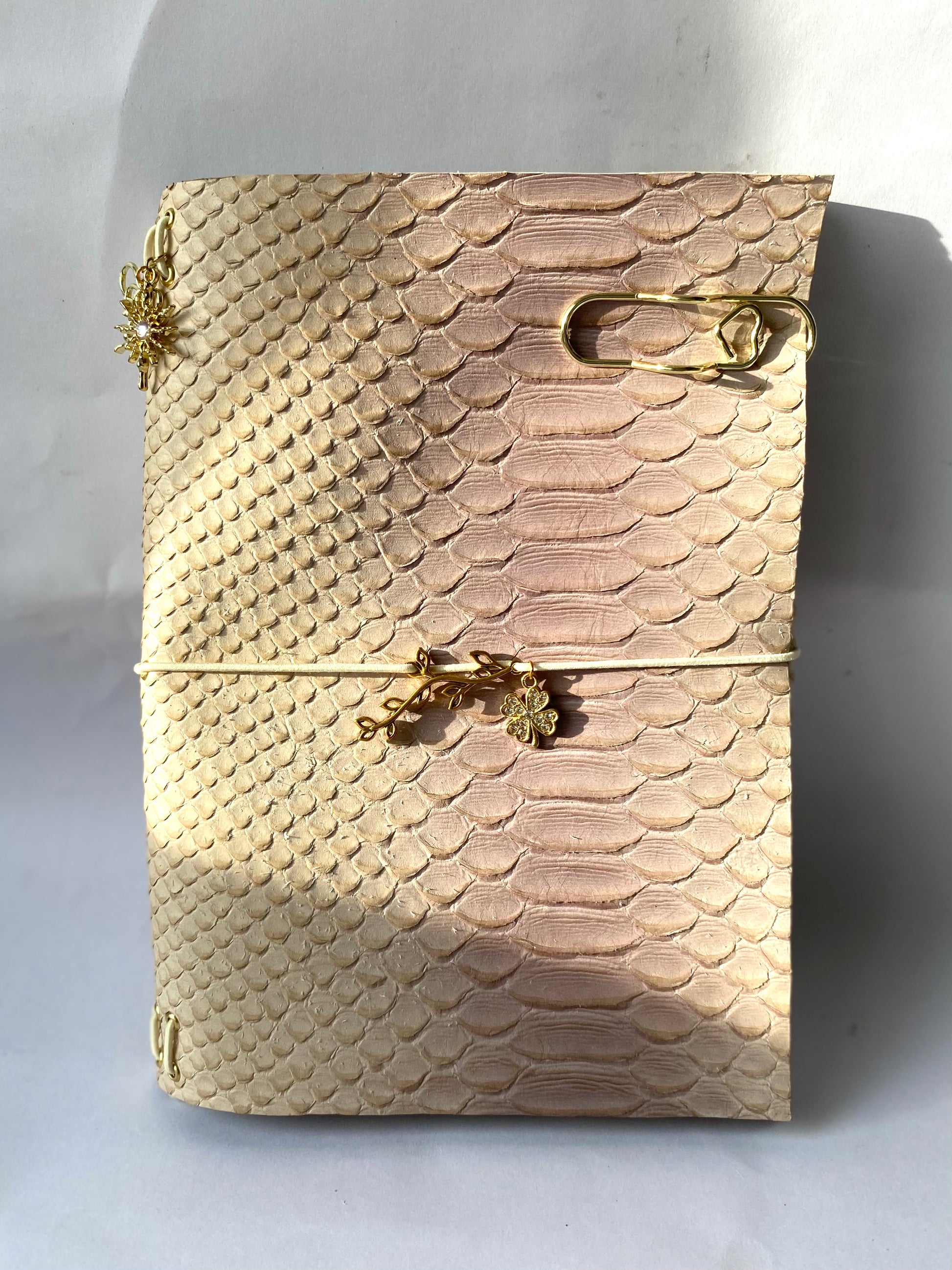 Carefully handcrafted from each cut to the finest detail, the Belle Trifold Journal is made from top-grain cowhide leather and finished with an elegant snake pattern stamp. Thoughtfully designed for both beauty and function, it includes 2 notebooks, a pen holder clip, and a paper folder organizer, along with the charms and strings shown. A compact companion for everyday notes, plans, and creative moments.